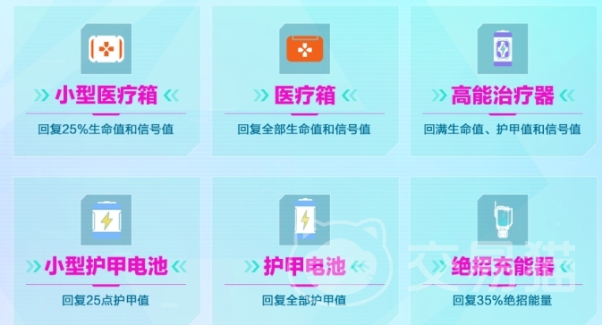 然后是大家都非常熟悉的恢复道具,恢复型道具不仅包括恢复血量的医疗箱,还有护甲能量恢复的电池,医疗箱跟电池都有两种,小型的是按照百分比来恢复,大的则是全部恢复,其次还有一个高能治疗器则是将所有数值全部恢复满,以及绝招充能器帮助大家恢复绝招的能量。