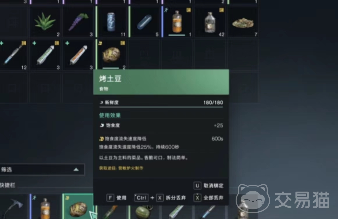 我们前期需要做一些什么准备工作呢?首先就是要把水和食物都带好。保证进度值,健康值都能达到一个很舒适的状态了。然后利用烤土豆,这个是降低饱食度流失,还有另一个就是橘子汁,也可以用新鲜的生橘子,就是烤这个烤橘子它是会得到一个移动速度的一个提升,玩家小伙伴可以做一个参考,然后子弹一定要备好。