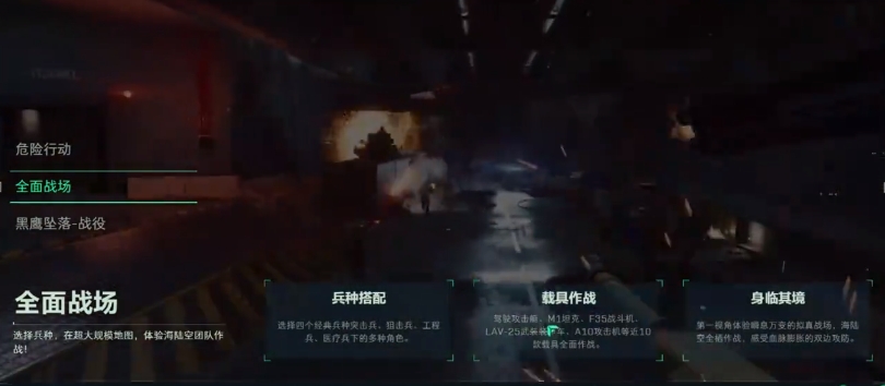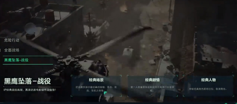 最后一个模式就是必玩的黑鹰坠落模式,这个模式中的画面感是最宏伟的,大家也可以看到作为任务的动画展现,但是利用科技进行对战的模式中,其实黑鹰是最适合大家挑战的,主流作战还是在天上,这里驾驶直升机做战的情况要比陆地作战多一些,喜欢空中作战的就可以选择这个模式。