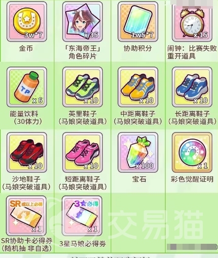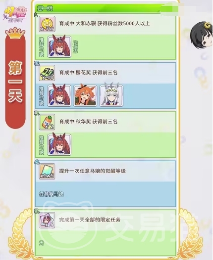 在第一天的任务中大家需要获取到樱花奖的前三名次,才可以获取赛里鞋子的奖励,这个奖励道具可以帮助大家给赛马娘做提升消耗作用,所以小编建议大家还是前期培养一下要参与樱花奖的赛马娘,将这个奖励拿到手里比较好哦。