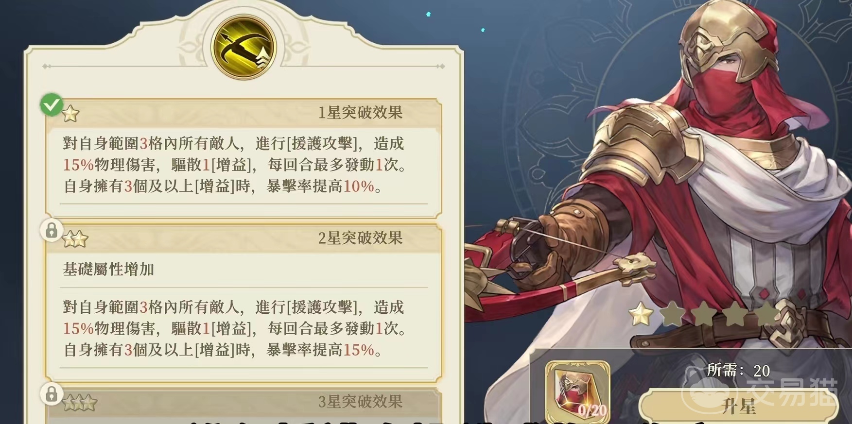 首先来说一下利刃这个角色的星级突破效果,当达到了一星的时候,就能够将自身三格范围里面的所有敌人进行攻击,而且能够对他们造成15%的物理伤害,并且如果他自身所拥有三个以上的增益效果,那暴击率也会提升10%,当达到了二星的时候,同样也是能够对自身三个范围里面的敌人造成15%的伤害,并且当自身所拥有的增益效果达到了三个以上,就能够将暴击率提升15%,总之升的级数越高,所带来的暴击率以及伤害肯定是越大的。