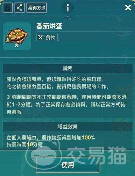 2、番茄烘蛋:番茄烘蛋的效果是,在个人农场中的农货量会增加为两倍,即使是在别人的幻森中也一样有双倍效果。在套用双倍效果的情况下,这样樱花瓣获得的数量也会变成两倍。简单来说就是采收一片农作物田获得农作物*6时,获取的樱花瓣也会变成6个。