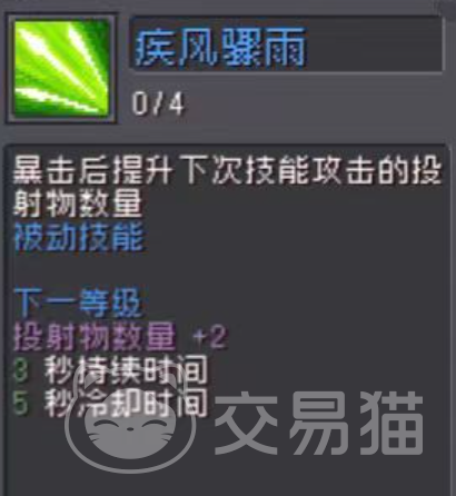 被动技能有3个,第一个技能需要游侠身边没有任何的单位才能触发,触发的能力可以提升自己的伤害,第二个被动在击杀敌人以后会发射一次弹片,加快清图的效率,最后一个被动则是暴击以后下次的攻击数量增加。