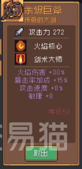 之后是第二把武器余烬巨斧,这是一件巨斧传奇武器,该武器的攻击面板高达272,这个面板是相当高了。除了攻击高之外,当这武器升满之后所得到的属性词条和技能也是很强的,它的属性词条和技能都是会增加火属性的,如果大家是主攻火焰流的话,那效果是要比带猎魂长枪还好的。