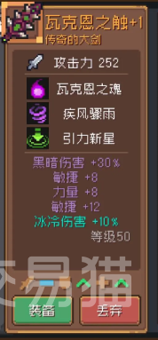 接下来就轮到普通的物理流了,物理流比起技能流在武器的选择上就要好选很多了,首先要给大家推荐的第一件物理流的武器叫做瓦克恩之触,这是一把传奇巨剑武器,该武器拥有252的攻击面板,在强化满级之后它还会增加几个数值属性词条,并且还会解锁三个直接伤害类型的武器技能,这三个技能分别是瓦克恩之魂、疾风骤雨和引力新星。在这些技能的加持下,它的物理输出比起射手这种纯物理流的职业还要高一些。