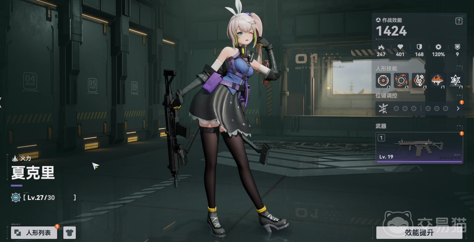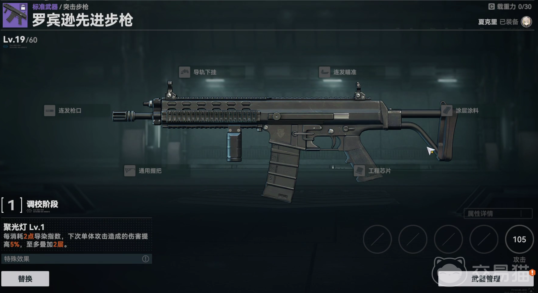 枪械方面,标准武器突击步枪罗宾逊先进步枪有着非常不错的火力压制效果,在中远程对局上有着极强的作战实力。就连角色本身的升级动画,也是展示了角色夏克里对于远程敌人的火力倾泻伤害,可以说,在数据方面也不逊色于其他人型角色。其给予的聚焦能力以及集火效果能对于单体或者群体敌人造成非常可观的后续输出伤害,在输出方面也不逊色于偶像之名。