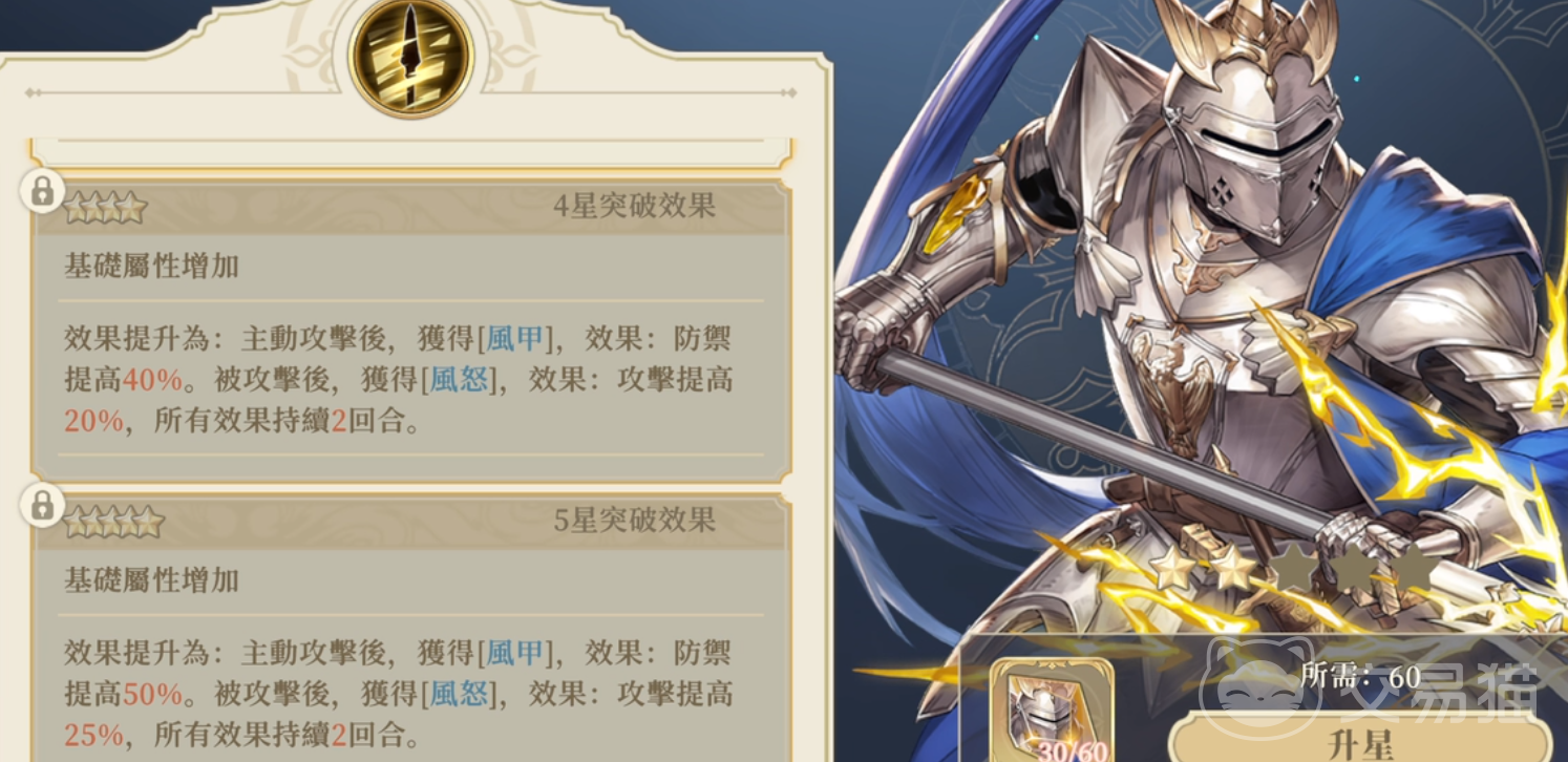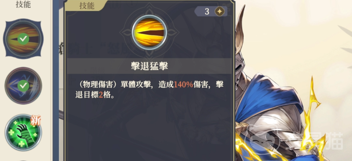 2、骑士的荣耀。支援瞬发技能,使目标获得持续两个回合的攻击2buff。如果目标是骑士同盟阵营的队友,额外获得20%HP值物理护盾。三阶段的技能,建议选择骑士的荣耀,这个技能不仅可以给队友增益,还能给自己叠上。至于怒风强袭,击退的能量三点,而且需要有buff加持才能击退,不太实用。