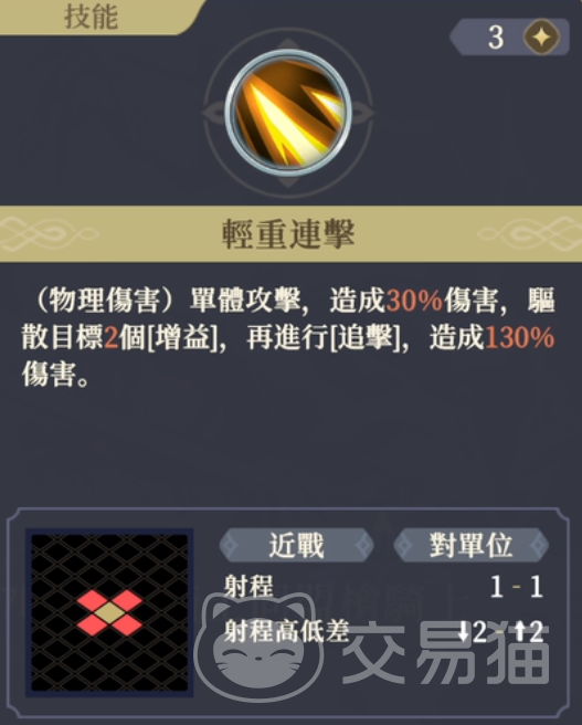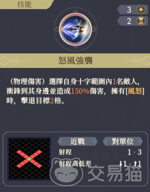 三阶:1、怒风强袭。选择自身十字范围内一名敌人,冲锋到其身边造成物理150%的伤害,如果当前持有风怒buff,额外击退敌人两个格子。技能射程最远为三格,高低差上下一格。