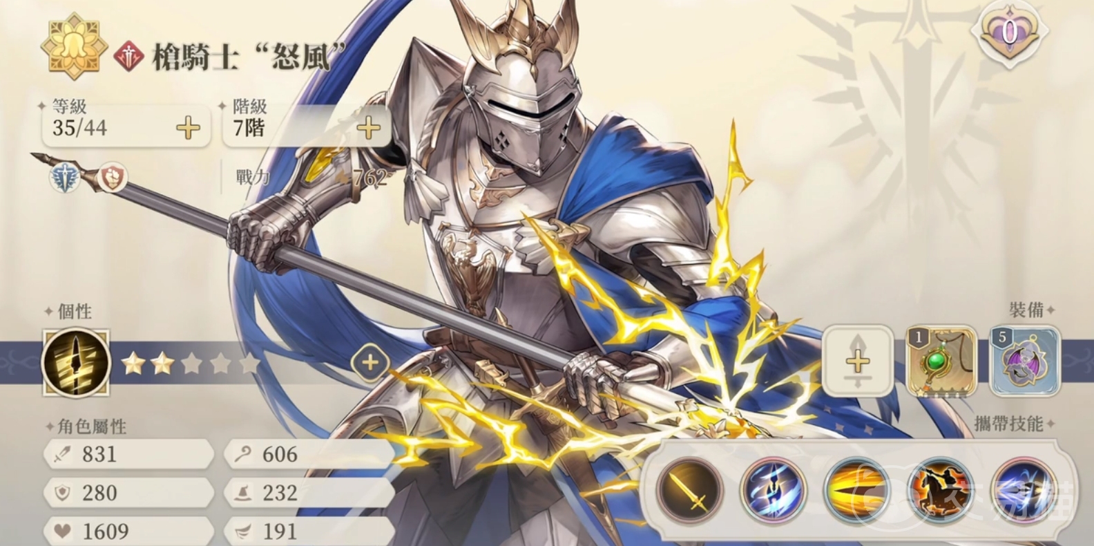 怒风称号是枪骑士,常用的武器是长枪,角色基础数值是移动力3、跳跃力2、生命309、物攻170、物防53、魔攻119、魔防58、敏捷191。
