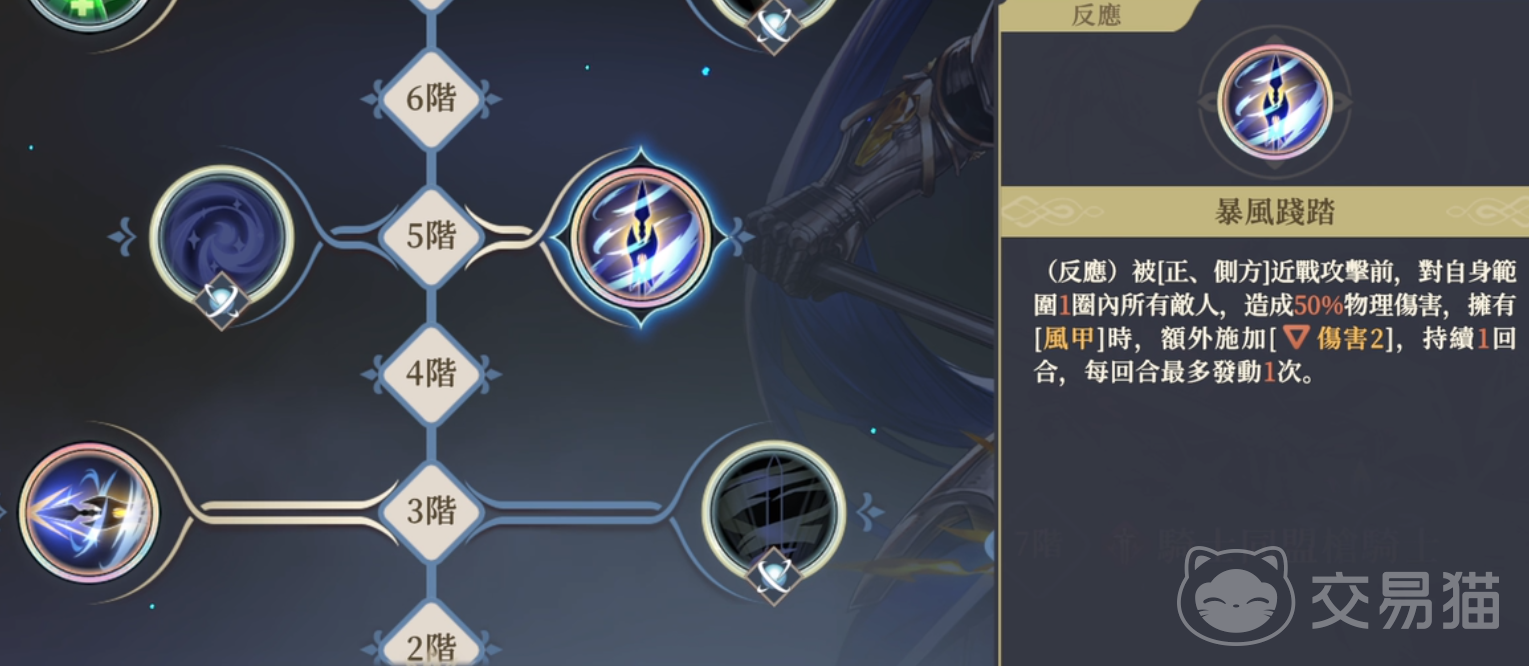 五阶:1、回能。反应技能,受到主动攻击降低8%的伤害,被主动攻击额外恢复一点能量。2、暴风践踏。反应技能,被正方或者侧方的近战敌人攻击之前,对自身范围一圈的所有敌人造成50%的物伤,持有风甲的时候额外施加降伤害2debuff,但每个回合最多发动一次。这两个反应技能都不错,但比较可惜的是游戏不能同时携带两个反应技。回能好处补充技能消耗能量较多,而暴风践踏虽然无法直接打高额伤害,但是可以收割残血,省一回合输出动作。而且有时候打王能降伤,对推图有需求的玩家优先选择暴风践踏。