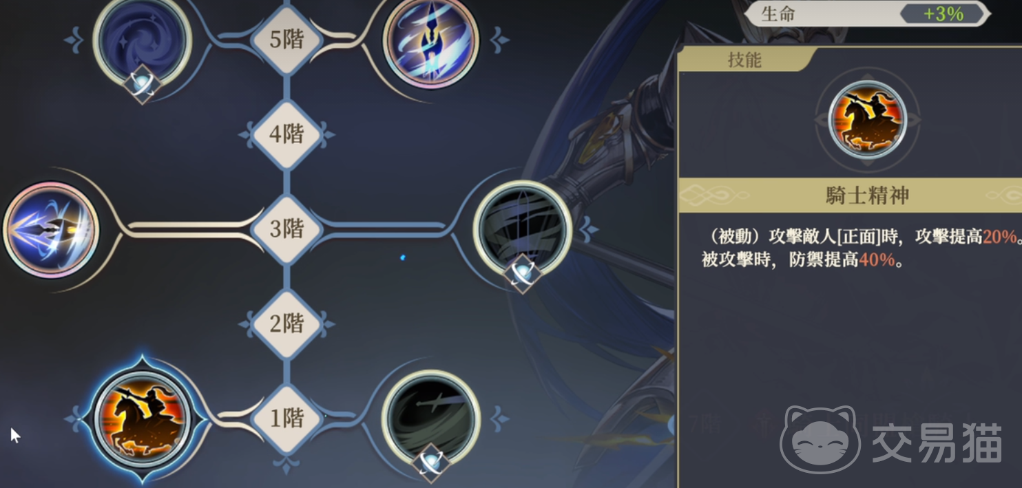 一阶:1、骑士精神。被动技能,攻击敌人的正面时候,攻击力提升20%,被敌人攻击防御力提升40%。2、顺势劈。被动技能,主动攻击后,对自身范围一圈的敌人造成全体20%物理伤害。一阶段的技能毫无疑问选择骑士精神,这个技能加攻又加防,因为对于现实敌方通常面向你,而且很多怪在遇敌时还会转身自动送正面给你打,打正面要比打背面简单多,同时打神兵王一定会打到正面,新手玩家也能轻松触发技能。至于顺势劈,这个技能打王比较好用,打一般般卡就不太实用,因为走位若有差错,很容易劈砍到地图物,比如让爆炸桶子爆炸,结果会炸死自己,因此这技能释放起来束手束脚的。