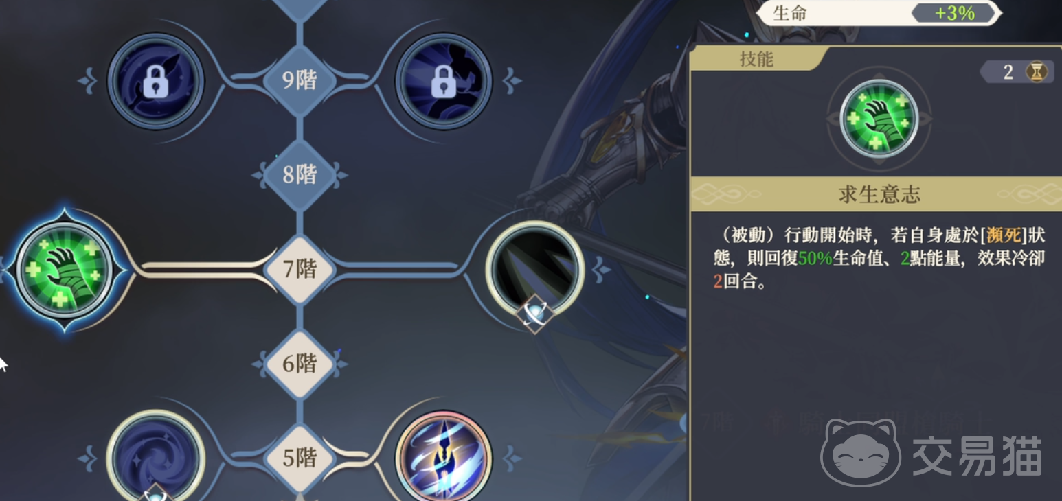 七阶:1、求生意志。回合开始,如果自身处于濒死的状态,那么立刻回复一半血量与两点能量,冷却CD两个回合。2、轻重连击。单体攻击造成30%的物伤,驱散目标两个增益buff,再次进行追击,造成130%的伤害。这两个技能根据考量点不同,有不同的优劣之处,新手玩家优先选择求生意志求稳。