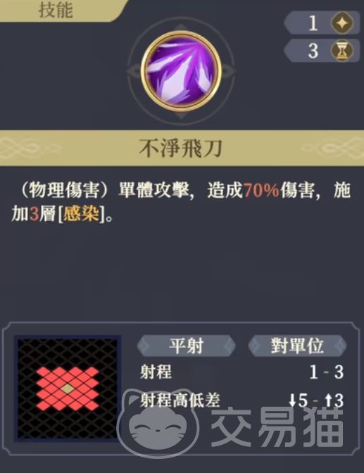 一阶:1、不净飞刀。单体攻击造成70%的伤害,并且叠加三层感染。2、机动。被动技能,主动攻击后可以再次移动,移动的距离取决于剩余的移动力。一阶技能选择上,不净飞刀适合打感染流的玩家,也就是中毒流血玩法,很容易叠满感染最高的9层。