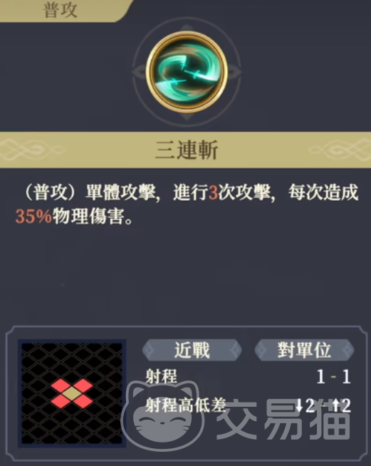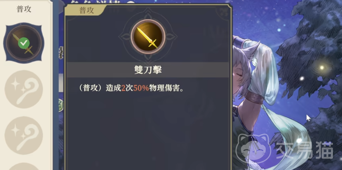 普通攻击:双刀击。打两次物理伤害为50%的普攻,伤害根据物理攻击力决定,范围也是刺客型角色常有的近身一格。
