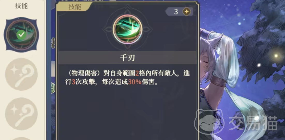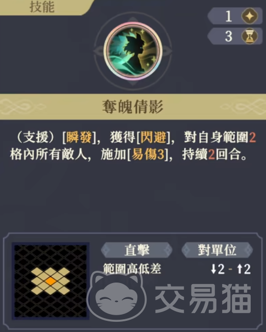 三阶:1、夺魄倩影。支援瞬发技能,获得闪避而并且对自身两格内所有敌人施加易伤3,受伤提升30%的debuff持续两回合。