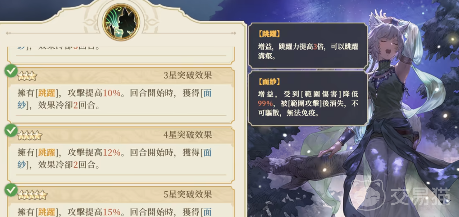 天赋个性神秘歌姬效果分为两部分,第1部分是持有条约以及攻击力提升,随着星级提高攻击力,提升效果是6%到15%。跳跃对于突击型角色来说是非常有用的特性,可以直接跳到高处或者水溝解决敌人,不用慢慢绕一圈爬上去,也可直接调用跳跃跨过高地差,逃脱没有跳跃的敌人。