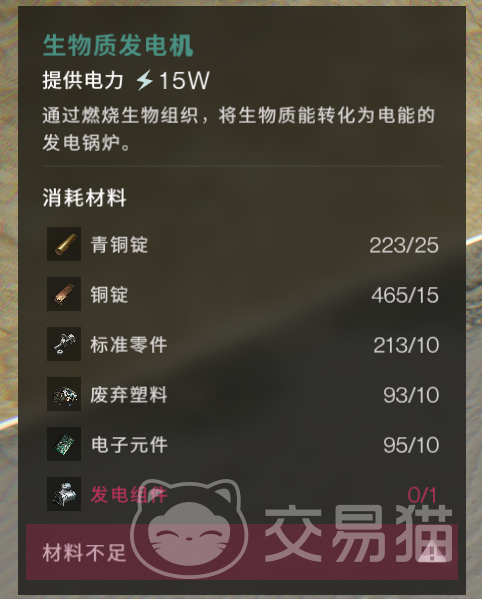 发电组件在游戏电力系统建造方面的重要性不言而喻,特别是各种发电机制作的必备素材,像是建造基础的【生物质发电机】,除了需要一些基础的矿石资源之外,就需要使用到零件、塑料、电子元件以及发电组件。在后期往光伏方向发展制作太能能发电机时同样也需要利用到发电组件。