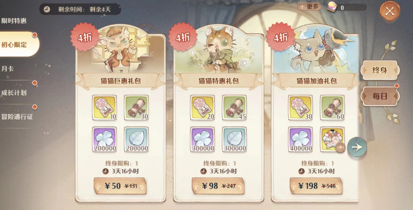 然后除了每日的初心限定以外,这里面还有一些终身的初心限定礼包,这个终身板块的礼包总共有五种,价格也是从50到648不等,因为更高的价格所以它们的奖励整体来说肯定都是要比每日板块中的礼包更好的。