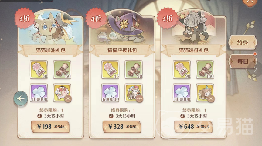 这两个之后就是价格三位数的礼包了,包括198的猫猫加油礼包,328的猫猫应援礼包,以及648的猫猫远征礼包,这些礼包里面没有了银叶奖励,转而变成服饰,背饰和坐骑,当然,前面那些礼包中的扭蛋券,强化卷轴和银花它们都还是有的,并且给的数量也是一个比一个高,除此之外,它们代替银叶给的东西也都是金色品质,对于外观有很大的改变,获取之后能直接成为人群中最亮眼的那个存在!
