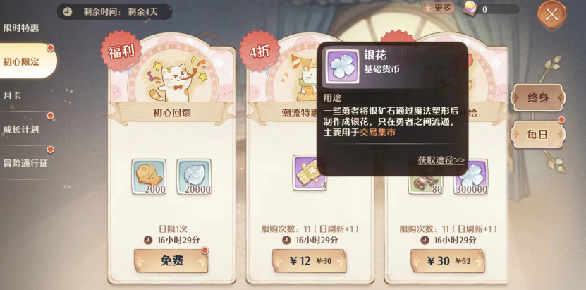 后面两个则分别是打了4折,售价12的潮流特惠补给,以及打了6折,售价30的冒险超值补给,它们分别提供了一个时装扭蛋券,以及80强化卷轴和300000银花的奖励,虽然12块的礼包要便宜一些,但如果你不是很注重外观,也没什么买的必要。