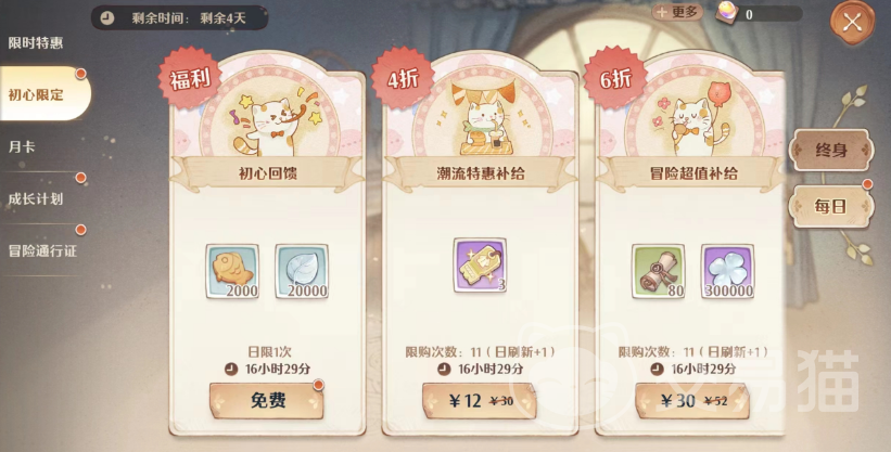 该礼包分为两大类,第一类是每日礼包,这一礼包主要有三种,第一种是日限一次的免费礼包,虽然里面只有些鱼干和银叶,但因为是免费的所以直接无脑拿。