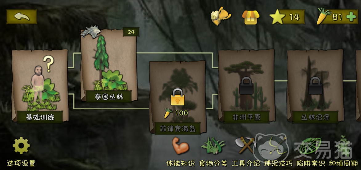 本期给大家分享的是挨饿荒野图文全攻略,挨饿荒野是一款生存挑战类游戏,玩家扮演的是的是一位荒野求生者埃德,主要玩法就是在各种恶劣的环境中生存,游戏虽然画质比较简单,但有很多地体,包括泰国丛林,菲律宾海岛、非洲平原、丛林沼泽等,每张地图的资源类型和玩法都不一样,所以本期小编给大家带来的就是泰国丛林的玩法攻略。