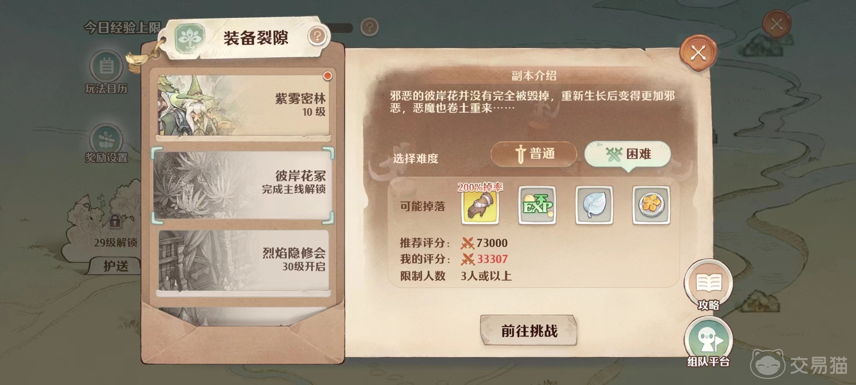 第三个条件的达成难度是最高的,你需要前往装备裂隙玩法中,于困难版本的彼岸花冢中战胜里面的boss血色彼岸花,只有这样你才能够完成,而该副本在初期的时候是并不能解锁的,它本身既需要你推进主线,又需要你拥有足够的实力,同时想打困难版本的这一副本还得要求你先把前面的普通难度给打过。