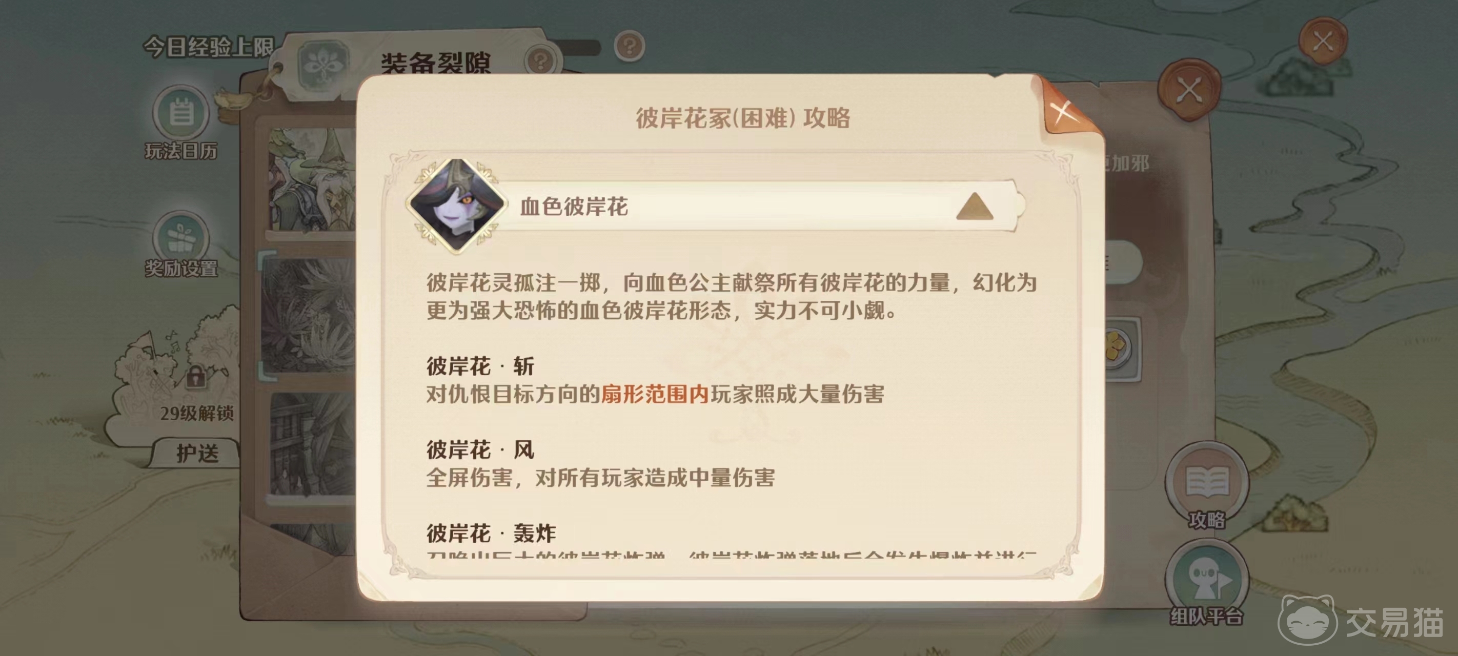 而且该副本中的boss强度不低,不仅拥有高额的属性,而且各项技能也十分的厉害,首先彼岸花·斩就可以对扇形范围内的玩家打出大量伤害,所以选择近战职业的朋友首先就很难跨过这一步,毕竟你去攻打这一副本的时候多半也只有二三十级,而boss的各项属性基本都是完全碾压这一等级的,加上扇形的超大范围和本身就很高的技能数值,想打过它会相当的困难。