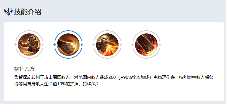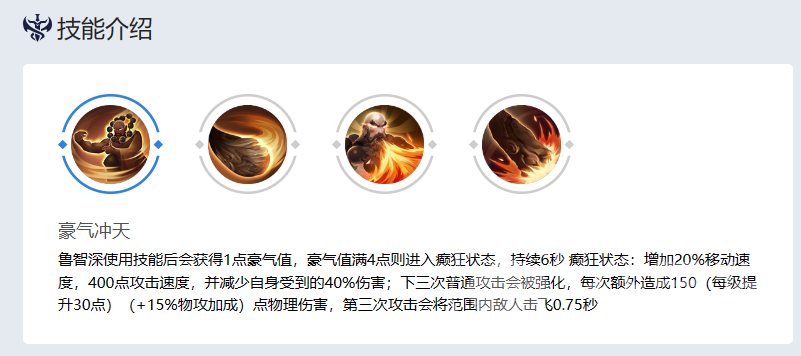 二技能:鲁智深向前冲锋一段距离,对沿途的敌人造成物理伤害,并且减速他们。如果鲁智深撞到敌方英雄,会停止冲锋,并且将敌方英雄带到身后,造成额外的伤害和眩晕效果。三技能:进入狂暴状态,增加自己的攻击速度和移动速度,同时免疫控制效果。在狂暴状态下,的普攻会对周围敌人造成溅射伤害,并且每次普攻都会回复自己一定的生命值。