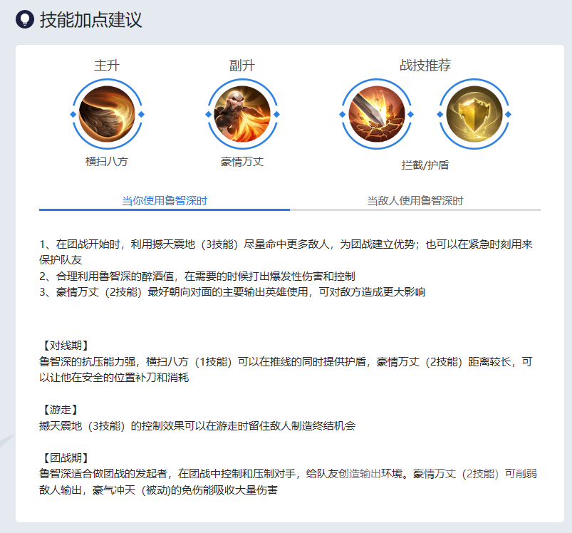 鲁智深适合打上路或者辅助,他的任务是保护队友和打乱敌人的阵型。他可以利用二技能抓住敌方的后排或者打断敌方的技能,然后用一技能将敌人击飞,造成大量的控制和伤害。他的三技能可以让他在团战中无视控制,持续输出和回血,同时也可以用来逃跑或者追杀。