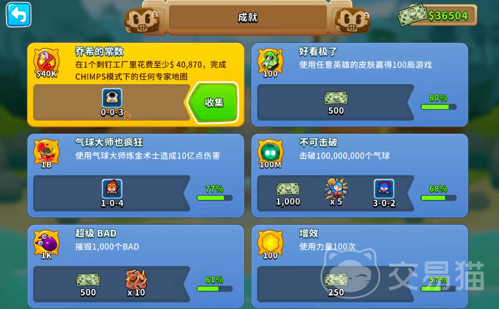 难完成的成就中后还有一个乔西的常数,这个成就是一个指定地图的成就,需要玩家去挑战专家地图,在这个地图中需要大家选择点击模式,然后去参与的过程中必须使用到刺钉工厂,给这个工厂进行升级花费的金币最少也需要会超过41000金币,这样的方式大家就可以拿到工厂猴卡的奖励啦。