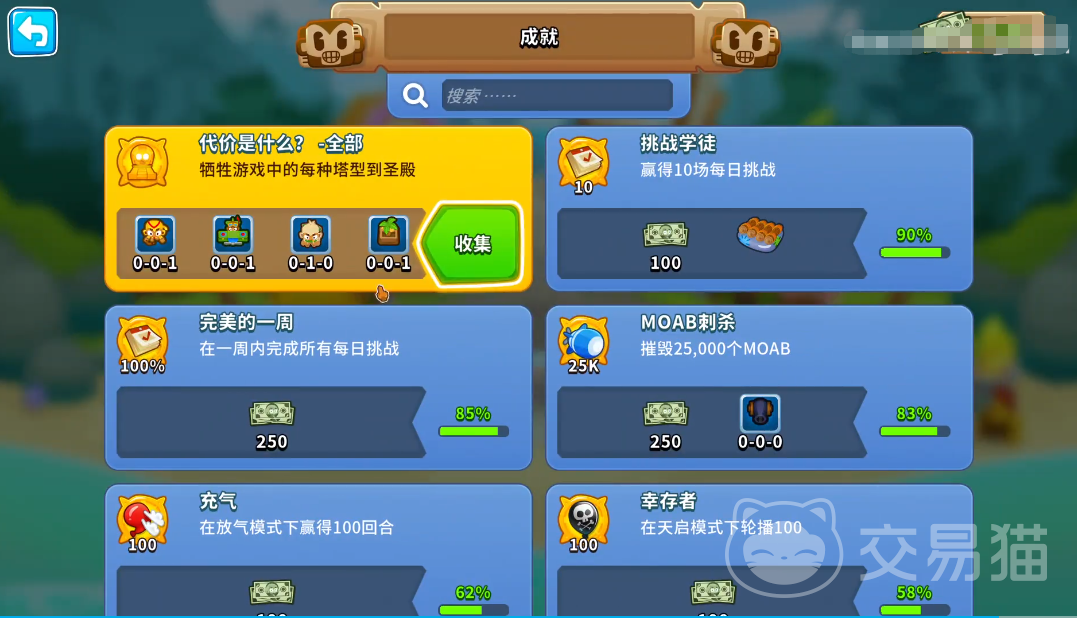 首先是代价是什么这个成就,这个成就是跟游戏中的献祭有关的,玩家需要在游戏中牺牲几个类别的防御塔,当然这里指的是牺牲的防御塔献祭神殿,而不是指的献祭出去的防御塔的类别,在完成这个成就之后大家就可以获取一个回旋镖猴的猴卡,以及飞机猴卡还有角色猴卡,虽然完成难度很高,但是大家能够拿到的奖励也很高。