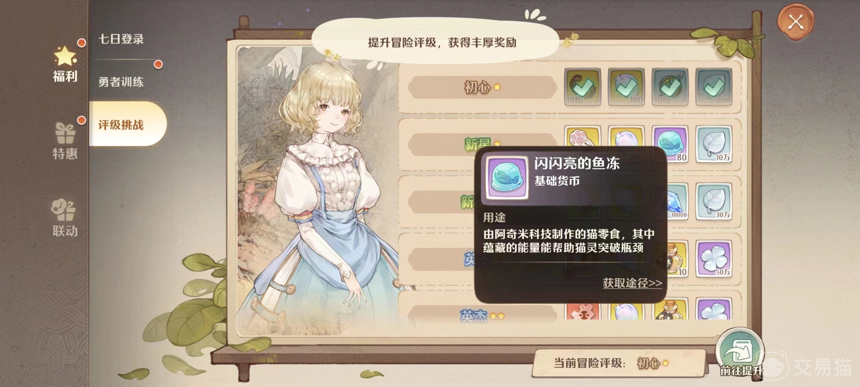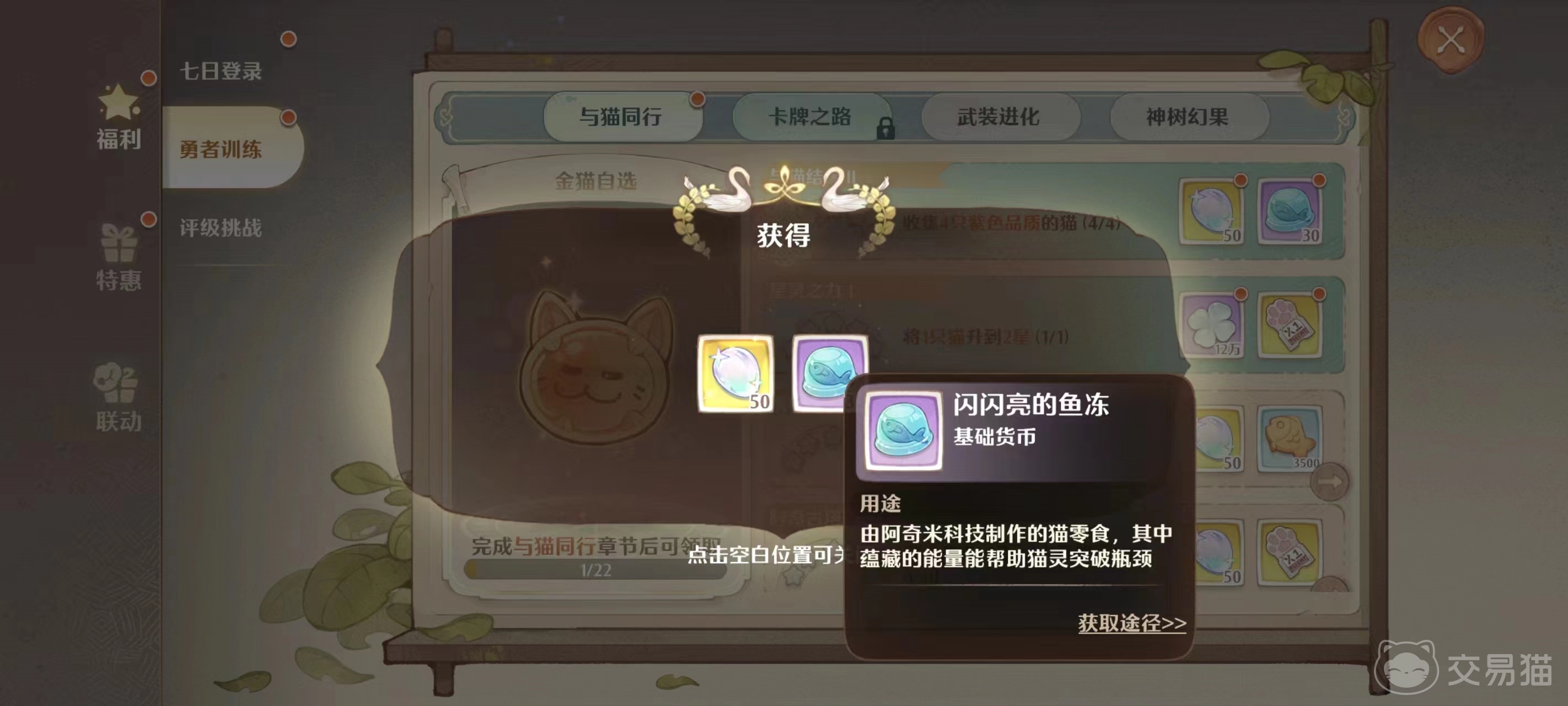 第一种方法是前往福利中的勇者训练直接领取,它里面的第一章节与猫同行会赠送大量猫灵材料,其中包括闪闪亮的鱼冻,里面给的数量还是挺多的,可以在前期的时候大幅加快你培养猫灵的速度。