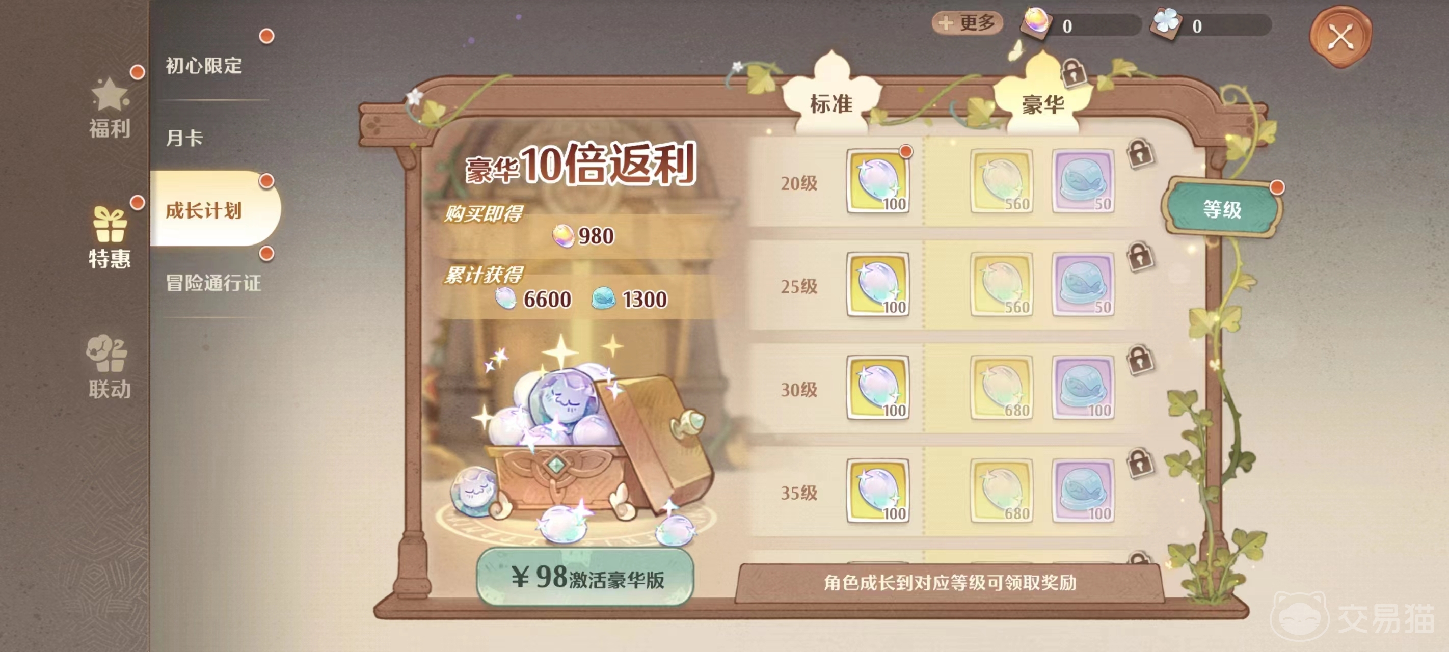 最后两种途径也在福利中,一个是免费的评级挑战,通过提升自己的评级可以获取大量的鱼冻,另一个途径则是付费的成长计划,该计划相当于同类游戏的通行证,不过里面的鱼冻需要激活豪华版才能获得,激活后共计可以得到1300鱼冻,对比其他途径来说产出的数量会更多。