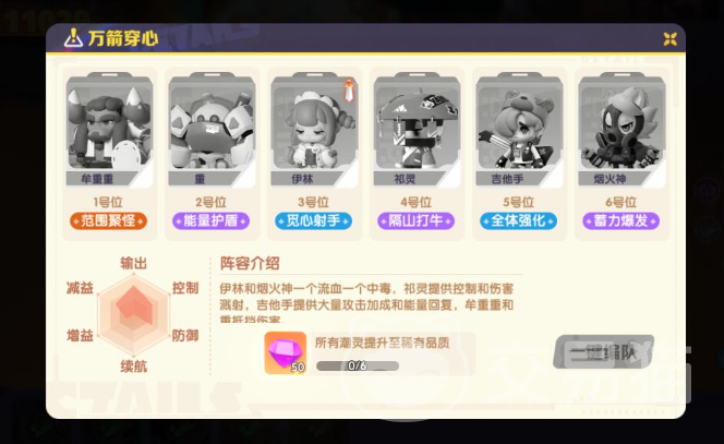 这套组合推出一个均衡,没有什么弱点,凭借着祁灵隔山打牛这一招可以攻击到多个敌方单位,吉他负责给所有人加攻击加能量,重重则可以在前面聚怪挡伤害。