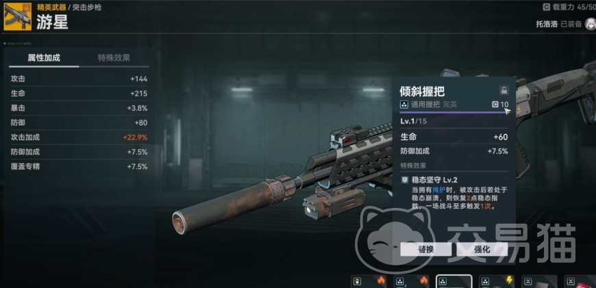 另一个非常重要的系统,进到武器的页面在右下角可以看到武器的被动,每个武器都拥有着独特的被动,通过调校可以升级,升级所需的也是抽卡后重复得到的武器,最高可以升到6命。当然除了升级被动技能外,还有配件系统,武器的“载重力”决定了武器可用用什么样的配件,紫色的消耗载重是10,而传奇的则是20,而在一众配件里只有枪口配件可以加武器载重力,紫色的加20,传奇的加50。