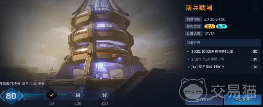 每天20点24点开放,单人或者组队的12VS12。在进入战场之后,敌对的双方需要通过占领据点和击杀对方的方式来获得积分,哪一方的积分率先达到7500点就可以获胜的。比赛有12分钟的时限,如果在时间结束前都没有到7500分那么积分更高的那一方获胜,积分相同则视为平局(一般出现平局的机会不多)。在该模式中阵亡不会损失装备的耐久度而且可以无限复活,属于是有点像传统射击游戏的玩法了,突出一个精彩刺激。