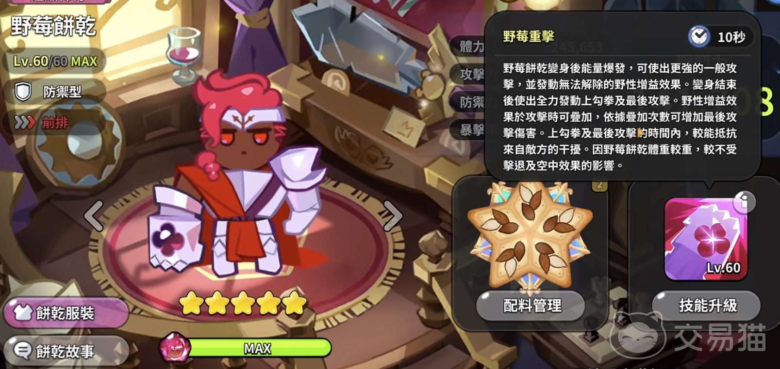 然后介绍的角色是野莓饼干,她也是一名防御型角色。但和圣莓果不同的是,她是强在她不吃敌人的击退效果,这让她在前排位置有着非常耀眼的表现。此外,她的技能还能增加她的普攻能力,在战斗中表现得十分强势。