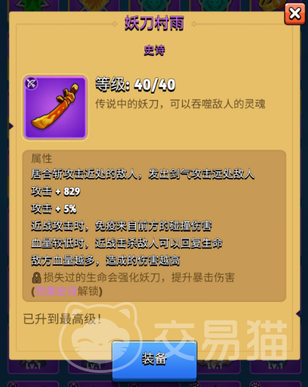 妖刀村雨:这算是目前版本性价比和综合强度都非常高的一把武器,它仅仅四十级的时候就能提供829的固定攻击加成和5%的百分比攻击加成,而且该武器可谓是近战和远程通吃,近身时可以进行大范围的劈砍,而敌人距离较远时则可以直接释放剑气进行攻击。