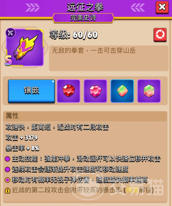 远征之拳:该武器是一把近战武器,虽然它的攻击距离并不算长,不过却有着较高的攻速,所以能够在近身作战时利用这种高频率的攻击来打得敌人措手不及,另外它在近身作战时还可以配合操作来打出二段攻击,这对于喜欢近战操作的玩家来说是非常具有优势的。