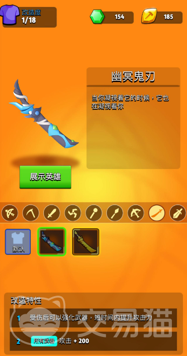 幽冥鬼刀:它作为一把金色武器不仅攻击范围可观,而且基础的面板数值也非常不错,除此之外,通过改造它还能够获得全武器攻击加两百的特性,以及受伤后攻击力提升的特性,两项特性可谓是相得益彰,让本就攻击力高超的角色变得更加生猛。