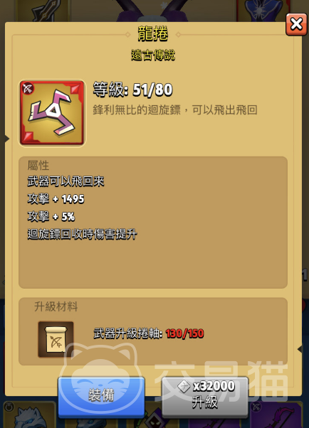龙卷:这把武器算是一个远程的武器,它的用法和现实中的回旋镖类似,朝敌人掷出后还可以自己飞回来,因此每次攻击相当于都能够造成两段伤害,另外它的属性也算是非常可观,仅仅51级就能提供1495的攻击力和5%的攻击力,这些加成的类型丰富,分别覆盖了固定数值和百分比数值两个层面,可谓是给予了角色全面的提升,另外它还有一个回旋镖收回时伤害提升的被动,这也令它的操作收益进一步提升!