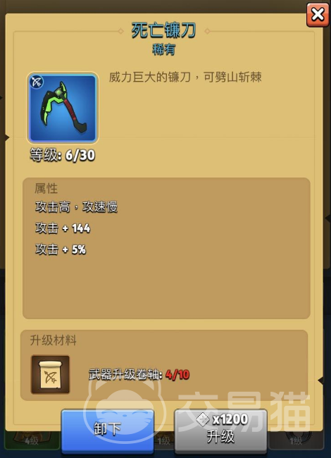 死亡镰刀:该武器是一个近战武器,在前期的时候会比较强势,这主要得益于它较大的攻击范围与较高的攻击力,仅仅六级就能提供144的攻击和5%的攻击,这份高额的攻击加成可以让它在挥砍敌人时表现出非常强势的压制力,不过它的攻速比较慢,所以一定程度上来说是非常吃培养的,只有当攻击数值上去之后这份攻速上的劣势才能被逐渐抵消。