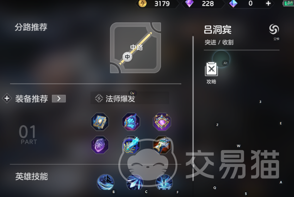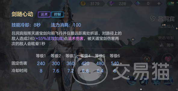 一定注意不要升级【六极剑意】,这个技能在前期非常不好触发,这个技能触发是需要吕洞宾身上的剑意达到6层的时候才可以触发的,而且这个剑意必须是释放技能才可以,所以对于连招方面,前期没有大招之前就主升级【剑随心动】就可以了,当四级之后就可以大杀特杀了;
