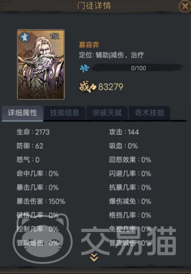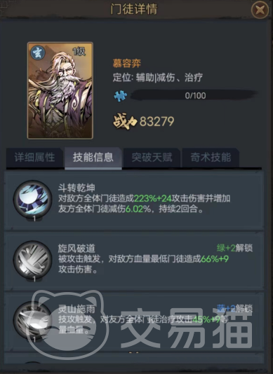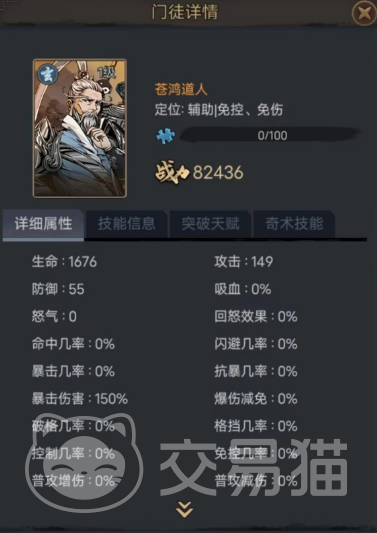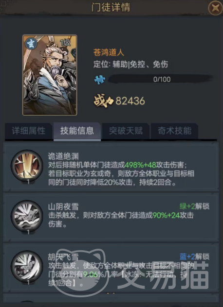 最后推荐的这个则是苍鸿道人,对比前两位他的战力,血量和防御都要略低,不过攻击却达到了更高的149,更高的攻击配合其主打后排的一技能“诡道绝渊”会有着十分强劲的表现,因为这招的加成高达498%,并且基础伤害也有48,而且在攻击的目标职业为奇或玄时,还可以令与目标职业相同的所有敌人降低20%攻击!
