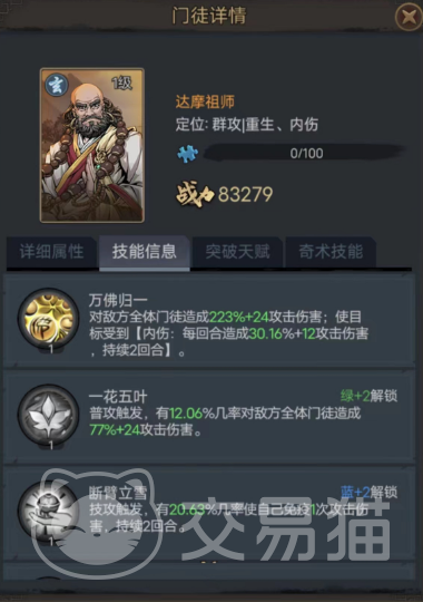 一技能万佛归一是个全体伤害技,可以对所有敌人造成223%+24的攻击伤害,并且还会为所有目标附加内伤效果,这一效果会让他们在接下来的两回合内持续掉血,所以这招可谓是兼顾了爆发与持续输出。