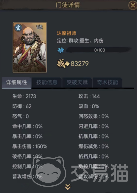 第一个推荐的是达摩祖师,该角色的攻击和血量都属于一流水准,六十二的防御数值也算得上中上游水平,同时他的四个技能也能发挥显著作用。