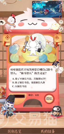 鼠门的这个称呼其实是来源于痒痒鼠的嘴巴里,刚开始也是为了表达对大家的一种赞赏,比如在维权以及做公益上面都很棒。而失忆蛋这道题也是一个陷阱题,大家都失忆了所以选择哪一个都是对的。最后一道题会提到除斗皆八的含义,其实代表的意思是除了斗技之外,其他的方面都是很厉害的。