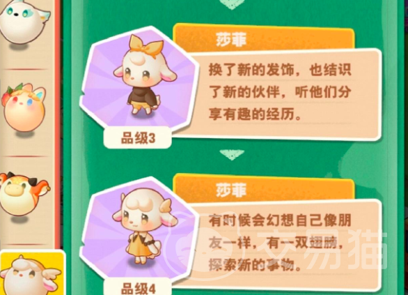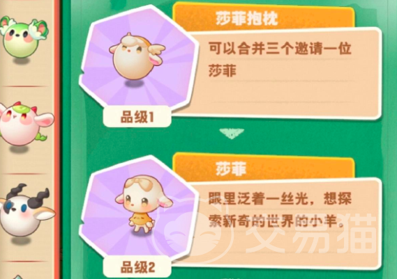 莎菲:莎菲是一只非常可爱的小羊,它是由沙菲抱枕合成而来的,当三个沙菲抱枕拼凑在一起,就可以合成出二级莎菲,他的造型非常q萌可爱,而且伴随着等级越来越高,这只小羊将会拥有更加好看的发饰,而且在游戏当中玩家还可以带着自己这只可爱的小羊一起结交更多的好友。