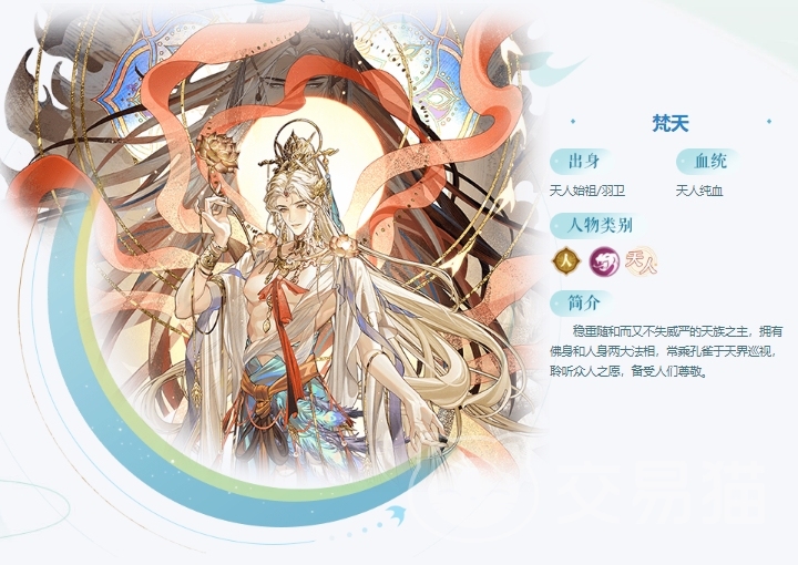 梵天:是一个具有佛性的角色,在外观上面有着敦煌元素的设定,而且在身份上面也是由羽卫出身的,作为一个具有天人血统的角色在游戏中是有很多剧情的,外观设定上面有多种色彩,但是看起来并不杂乱,最精致的是头上带的皇冠以及手上的莲花。